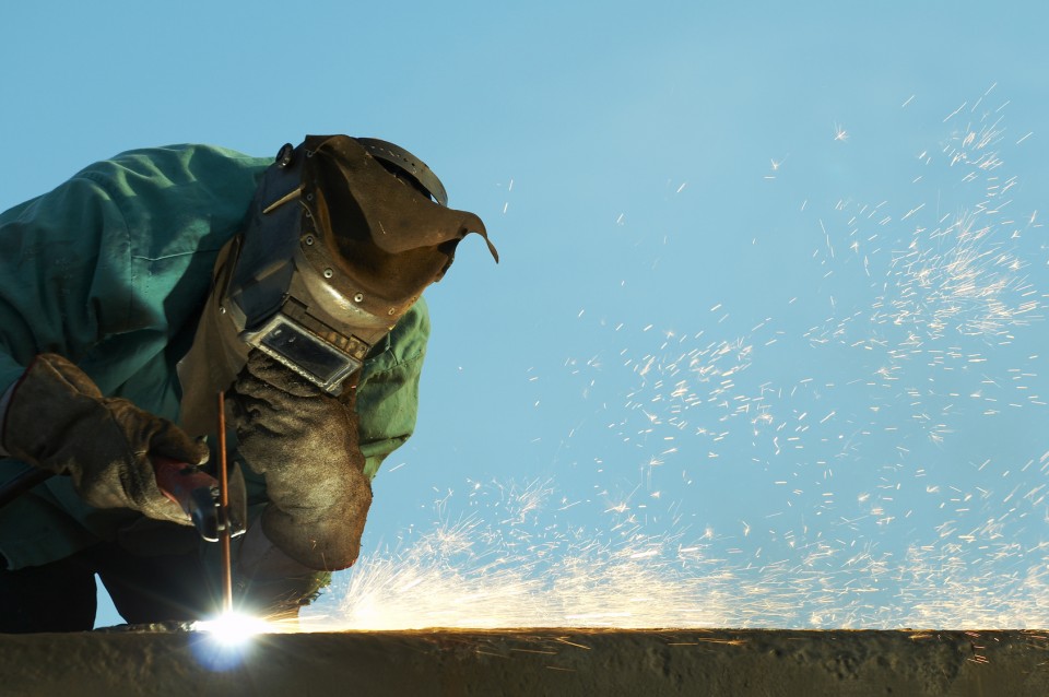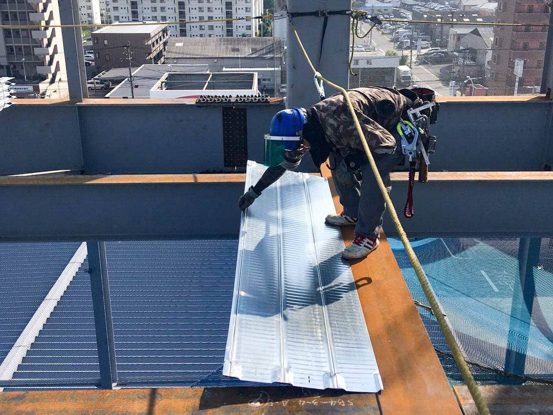 鉄骨と鉄骨の間に、鉄板の床を張っていき、しっかりと溶接をします。